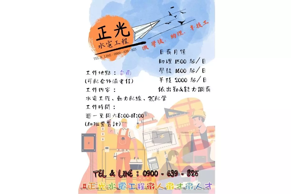 正光、正光水電、水電工程、水電學徒、水電半技、配管配線、燈插監控線槽施作、高低壓系統工程、台南水電工程徵才、台南水電工程職缺、台中水電工程職缺、高雄水電工程職缺、台南水電工程學徒應徵、台南水電工程半技應徵、台中水電工程學徒應徵、高雄水電工程學徒應徵、台南配管配線工程、台南燈插監控線槽施作、台南高低壓系統工程