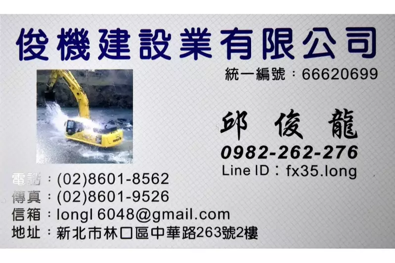 俊機建設業有限公司位於新北市林口區,專營各項挖土機作業、整地/拆除、廠房拆除、土方土木、疏濬工程、堆土機山貓作業、大鋼牙破碎機、大小型怪手出租...等,我們的機械設備齊全,能夠應對各類大小工程的需求,服務遍及全台灣,確保客戶能夠享受到高效率、高品質的施工服務。