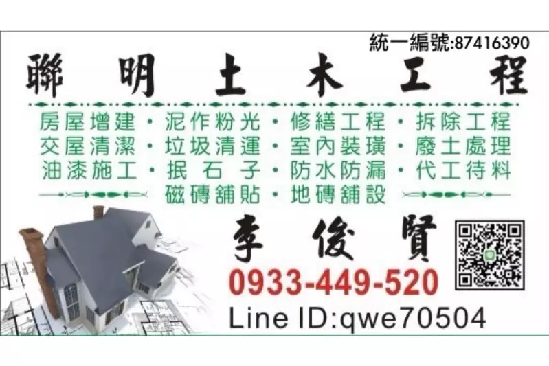 桃園市大溪區的【聯明工程行】,多年來深耕於泥作工程、統包工程與房屋修繕等各式建築工程領域,以細膩的工法與誠信服務的理念,贏得在地居民的高度信賴。無論是老屋改造、室內裝潢、局部修繕或全面翻新,聯明工程行皆以最專業的角度與細心的態度,為每一位客戶勾勒出理想的居住藍圖。