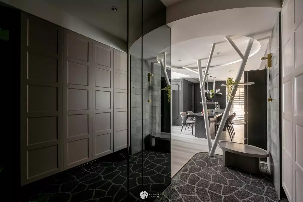 落塵區與懸空鞋櫃之間留出清潔動線、樹枝狀隔屏與石墩穿鞋椅則構成一個寓意深遠的角落。火柴形的壁燈象徵希望的微光,天花板上的圓形結構,預告即將展開的幻想旅程。隔屏更結合貓跳台與展示架機能,讓整體設計既有戲劇感又符合生活需求。