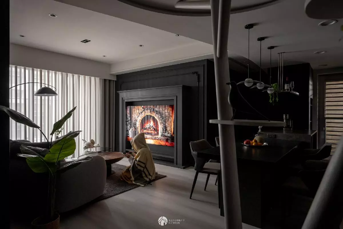 客廳以深灰為底,壁爐式電視牆成為視覺核心,也象徵小女孩眼中那團渴望的火光。線板與雕花細節延續法式語彙,在沉穩裡流露細膩情感。為避免灰色過於冰冷,空間以木質家具與布織品調和色溫,讓溫潤的光影在日常裡流動。
