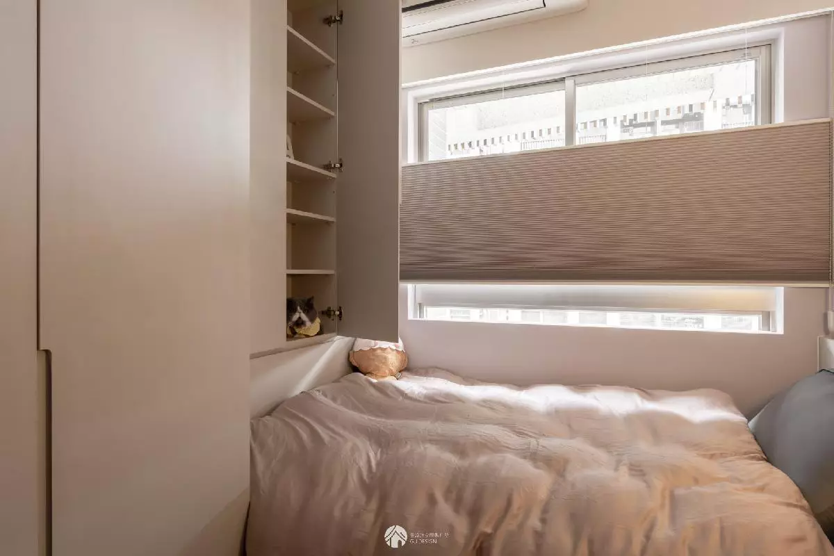 兩間兒童房則延續故事的希望篇章。第一間以亮色與蜂巢簾打造陽光氣息,兼顧安全與收納;第二間則給予更多留白,讓孩子未來能隨著成長自由轉化風格。