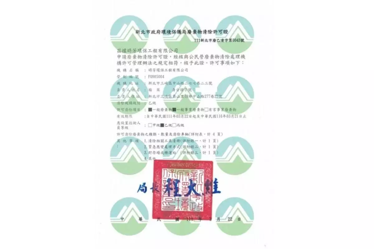 時芳環保工程獲新北市政府正式核准,擁有乙級廢棄物清除資格(許可證號:111新北市廢乙清字第0043號),專業資質是我們服務的保障。我們深耕北台灣市場,提供涵蓋台北市、新北市、基隆市以及桃園、新竹地區的全方位廢棄物清運服務。從公司行號、一般住宅、社區大樓到大型建案工程,我們皆能妥善應對,秉持效率高、品質佳的服務標準。