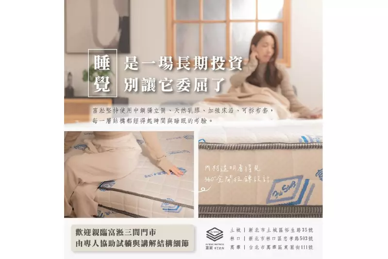 無論是材料選擇的嚴謹,還是製作工藝的細緻入微,富淞的每一張床墊都經過反覆測試與優化,只為給您帶來 最安心、最舒適的睡眠體驗。🌙