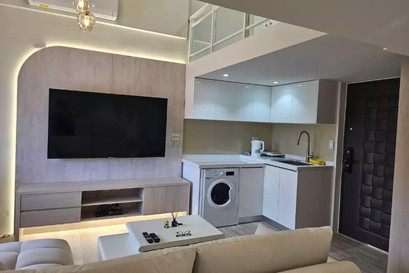 在設計規劃上,整體空間展現嶄新生命力:浴室配置獨立淋浴與分離式貴妃浴缸,廚房採紅白L型廚具與吧檯,搭配洗碗機與溫水機,機能完善。客廳以大紅沙發與大理石家具吸睛,臥室則透過木質與暖光營造溫馨氛圍;衣物間以粉色牆面結合大容量櫃體,陽台則整合洗曬機能。即使過程中遇到高樓監工挑戰與施工誤解,一岱仍堅持「良心施工、實在報價、如期完工」,讓業主真正放心。