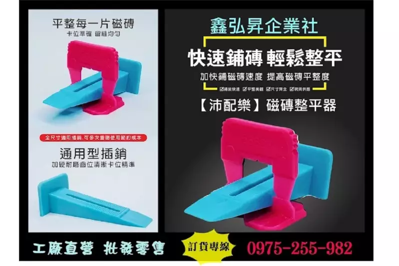 台中鑫弘昇企業社專營台製【沛配樂】磁磚整平器、瓷磚整平器、塑膠整平固定器批發,具備專業的台灣塑膠射出、設計開發、客製模具開發能力,提供OEM、ODM整平器與塑膠模具整合服務,廣泛應用於磁磚鋪設、建築工程等領域。產品品質嚴格把關,耐用可靠,深受專業師傅與DIY族群信賴。服務範圍涵蓋全省、全台各地,歡迎洽詢合作。◎ 鑫弘昇企業社推出專利認證【沛配樂】磁磚整平器——打造高效施工與完美整平的全新選擇隨著建築與室內設計產業對於施作品質的要求不斷提升,來自台中市龍井區的鑫弘昇企業社,正式宣布推出他們的最新專利產品——【沛配樂】磁磚整平器(專利認證編號:M568884)。這款升級版磁磚整平器,不僅大幅簡化了鋪磚流程,更能有效提升整體的施工效率與磁磚整平品質,無論是專業工程師傅還是居家DIY使用者,都能輕鬆上手、事半功倍。