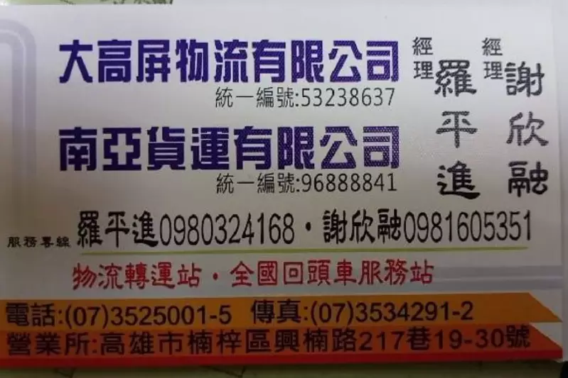 主要經營進出口貨物運輸、全省合台車、全省專車服務、全省急速件專車、北南托運回頭車、平板拖車運輸、平板散貨、特種貨物運輸,優質的貨運服務團隊,秉持顧客至上為大高屏物流經營理念