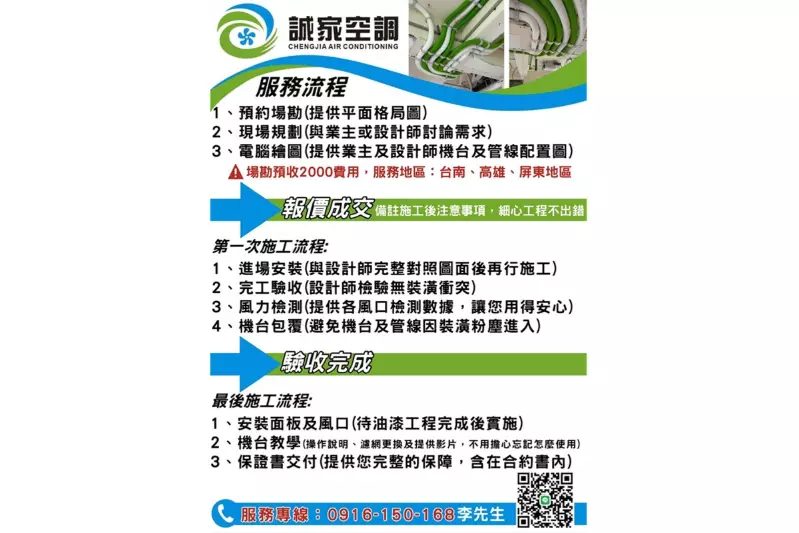 採用原廠合格配件、專業級空氣風速與溫濕度檢測設備,並在安裝完成後提供現場教學影片,協助業主快速上手、不易忘記操作步驟。